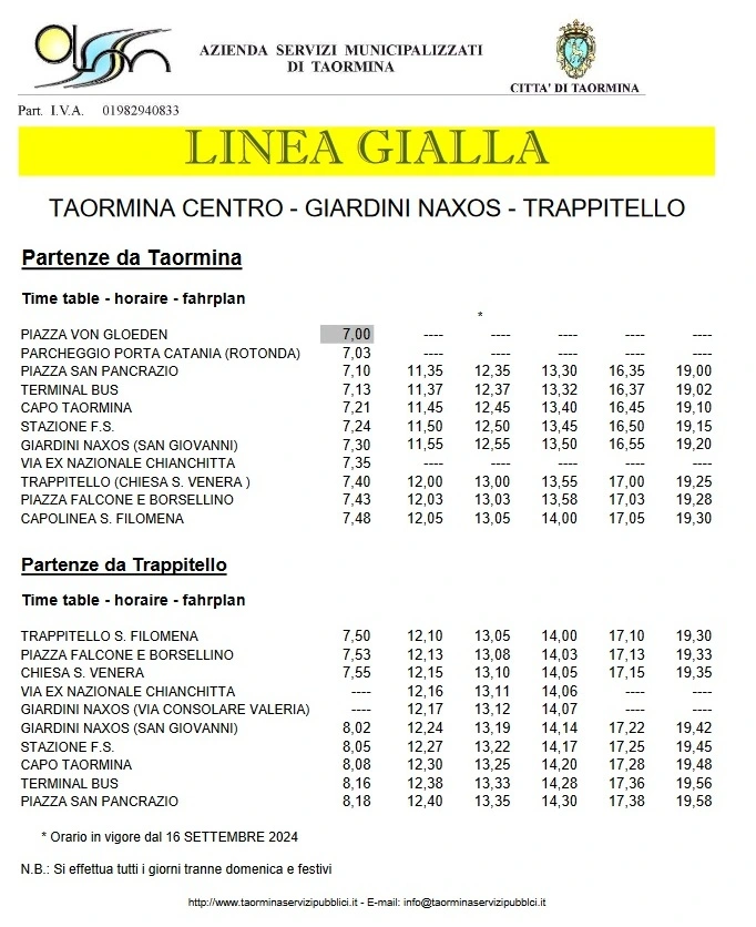 “Nello specifico il nuovo servizio, denominato Linea Gialla – spiegano da Asm Taormina – partirà da Taormina (da Piazza Von Gloeden solo la prima corsa delle 7, da San Pancrazio tutte le altre corse) e attraverserà Giardini Naxos dove effettuerà le fermate principali in piazza San Giovanni e via Chianchitta con capolinea a Trappitello in via Santa Filomena, con sei corse giornaliere. La prima corsa è stata fissata alle 7 da Piazza Von Gloeden per agevolare gli spostamenti degli utenti, in particolare studenti e pendolari, che potranno raggiungere le loro destinazioni (scuole e stazione ferroviaria) in maniera agevole, e proseguirà per il centro con fermata nella rotonda antistante il parcheggio Porta Catania (7.03), con direzione piazza San Pancrazio da dove è prevista la partenza alle 7.10. L’ultima corsa con partenza da Trappitello con destinazione Taormina è in programma alle 19.30. Il servizio si effettua tutti i giorni feriali ad esclusione della domenica e dei giorni festivi. È possibile consultare l’orario completo e dettagliato del servizio sul sito internet dell’ASM di Taormina”.