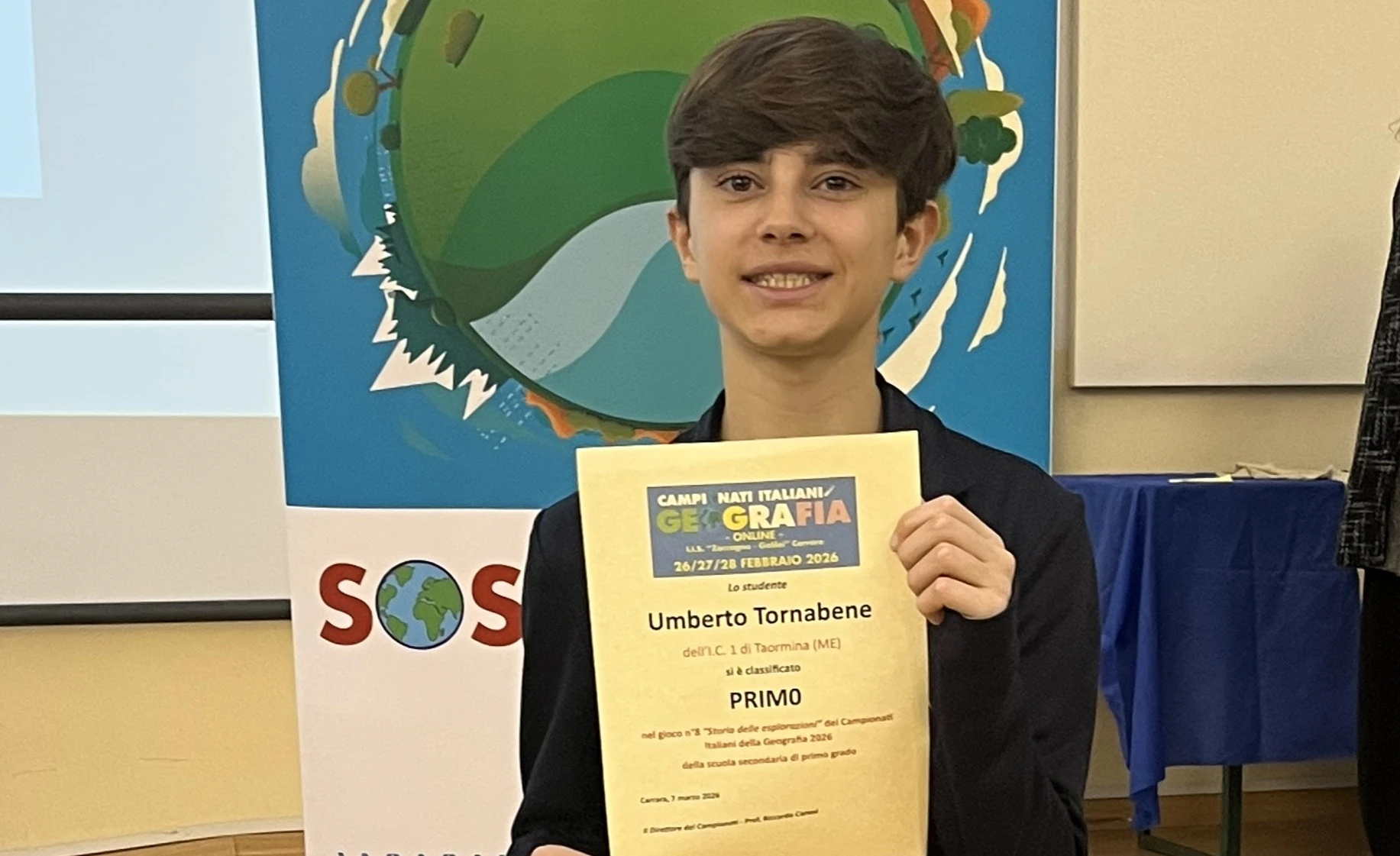 “La manifestazione – spiega Rita Messina, docente dell’Istituto Comprensivo 1 di Taormina – è stata promossa da SOS Geografia, A.I.I.G. e Zaccagna, ieri e oggi, con il patrocinio di Regione Toscana, Provincia di Massa e Carrara e Comune di Carrara e si è svolta all’IIS Zaccagna-Galilei di Carrara. La gara ha visto impegnati nei giorni scorsi circa 2.600 studenti, di 139 scuole, di 69 province, 19 regioni, più una scuola italiana all’estero (Atene). Ben 300 i quesiti, suddivisi in 12 blocchi tematici, inerenti gli strumenti della geografia, la geografia fisica e umana, la difesa dell’ambiente, le carte mute, i diritti umani, la geopolitica, la mobilità sostenibile, la storia delle esplorazioni e le bandiere. Alla manifestazione hanno portato il loro saluto Elsa Daniela Novelli, dirigente dell’I.I.S. Zaccagna-Galilei, Riccardo Morri, presidente A.I.I.G. nonché docente all’Università La Sapienza di Roma e Riccardo Canesi, ideatore e conduttore dei giochi. Tra gli ospiti, anche il biologo marino massese Lorenzo Bramanti, in collegamento dalla Terra del Fuoco e il colonnello Claudio Panizzi. Ad essere premiato l’alunno Umberto Tornabene, della classe 3A dell’Istituto comprensivo 1 Foscolo di Taormina plesso centrale, diretto da Carla Santoro. Tornabene si è classificato primo in Storia delle esplorazioni. Ottimo risultato pure per l’Istituto di Taormina, che si è classificato all’ ottavo posto tra le numerose scuole partecipanti. Iniziative come i Campionati della Geografia rappresentano un’occasione preziosa per valorizzare l’importanza della geografia nella formazione dei giovani”.