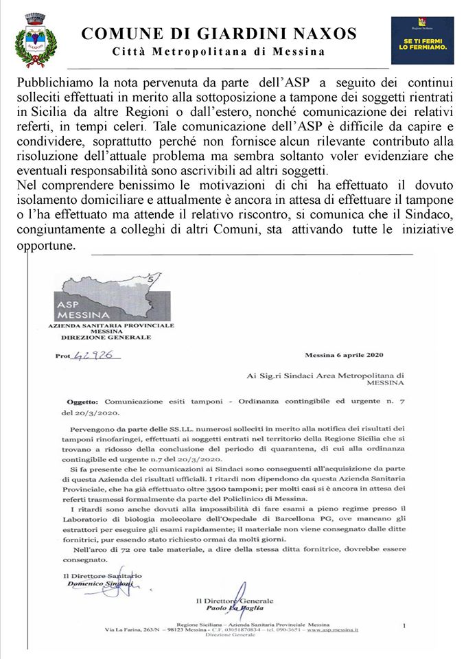 “Fermo restando quindi che continuerò a scrivere e sollecitare quotidianamente l’Autorità Sanitaria competente ad assolvere a quanto disposto con Ordinanza del Presidente della Regione, effettuando i dovuti tamponi e comunicando i relativi referti con più celerità possibile, al fine di non aggravare per nessuno le restrizioni già difficili e soprattutto di evitare gli eventuali problemi che potrebbero derivare dai ritardi in caso di esigenze lavorative dei soggetti, ricordo che il Comune, attraverso la Protezione Civile comunale, è a disposizione tra l’altro di tutti questi cittadini che si trovano in isolamento domiciliare forzatamente prolungato per ogni esigenza connessa al reperimento di beni alimentari e/o di prima necessità”.