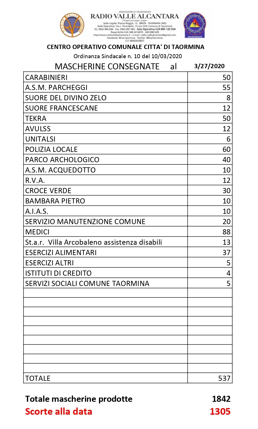 Taormina: mascherine consegnate fino al 27 marzo 2020
