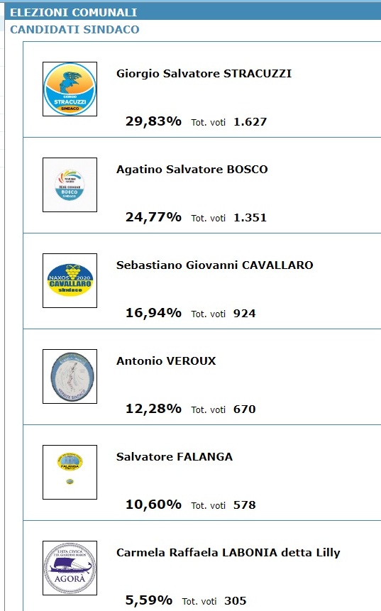 Giardini. Giorgio Stracuzzi, con 1.627 voti (29,83%) è stato eletto sindaco di Giardini. A seguire: Agatino Salvatore Bosco con 1.351 voti (24,77%), Seby Cavallaro con 924 voti (16,94%), Antonio Veroux con 670 voti (12,28%), Nino Falanga con 578 voti (10,60%) e infine Lilly Labonia con 305 voti (5,59%).
