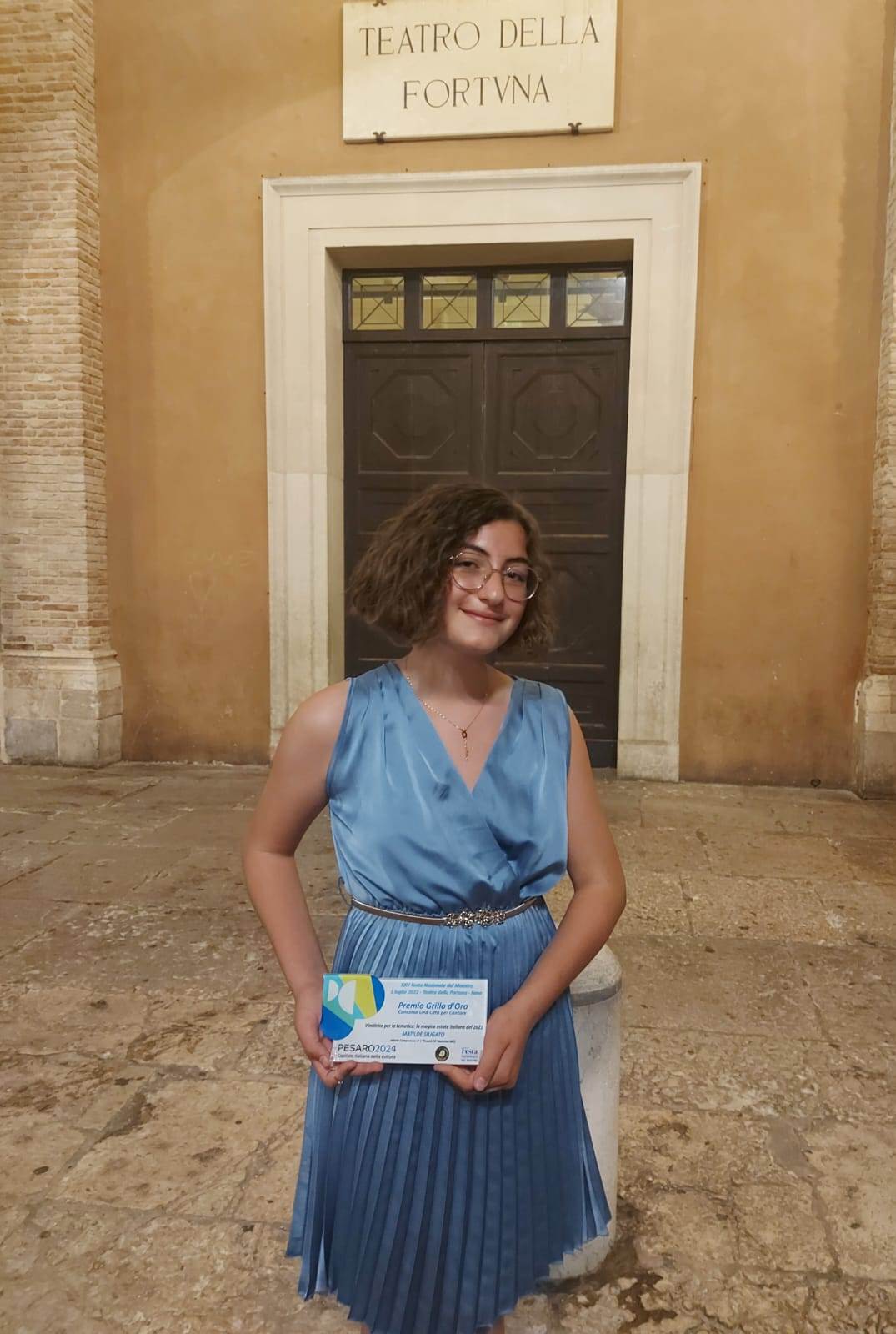 “Presenti sul palco – spiega la docente Marcella Managò – le figure più significative della nostra società, persone che sono un esempio di valori positivi, a partire da Annibale Giannarelli, vincitore di The Voice Senior 2022, fino ad arrivare alla senatrice Liliana Segre. Durante la manifestazione è stata premiata l’alunna Matilde Siligato della classe 2A del Comprensivo 1 Ugo Foscolo di Taormina diretto da Carla Santoro. Matilde è risultata vincitrice del concorso nazionale Una città per cantare e ha ricevuto il premio di fronte ad una grande platea per avere realizzato un testo sulla tematica La magica estate italiana 2021. L’elaborato, trasformato in canzone, è stato eseguito per la prima volta dal coro del Grillo d’oro, formato da 50 ragazzi guidati da Gabriele Foschi, direttore artistico e regista della festa. Preziosa e insostituibile è stata l’intesa con il Liceo Scientifico Musicale e Coreutico Marconi di Pesaro per la realizzazione del brano musicale. La realizzazione dell’elaborato presentato da Matilde è stata effettuata durante l’anno scolastico sotto la supervisione della docente di Lettere, Rita Messina”.