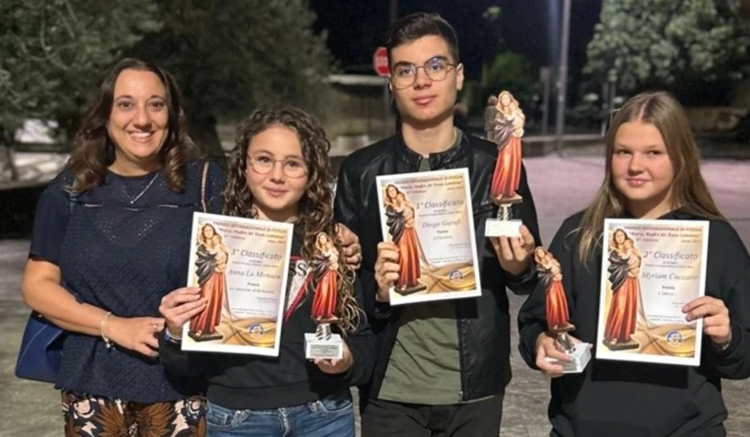 Taormina. “Sabato 25 ottobre, nella Parrocchia Sacro Cuore di Gesù di Trappitello – Taormina guidata da Padre Tonino Tricomi, si è rinnovato l’appuntamento con la cerimonia di premiazione del Premio internazionale di poesia Maria, Madre del Buon Cammino, giunto ormai alla XV edizione. Ancora una volta ad essere premiati gli alunni dell’Istituto comprensivo 1 di Taormina, diretto da Carla Santoro, che si sono aggiudicati i tre premi della categoria Juniores: Diego Garufi 1° posto con la poesia Il Paradiso, Myriam Cuccaro 2° posto con la poesia L’Amore, e Anna La Monaca 3° posto con la poesia Le emozioni della natura”.