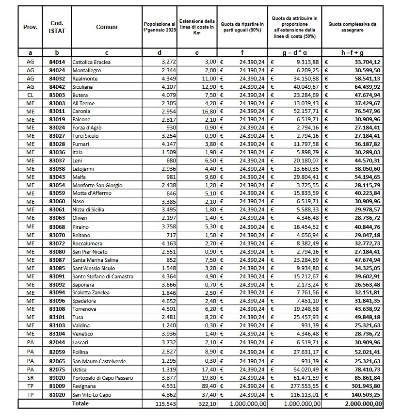 Le somme vengono assegnate a 41 Comuni costieri delle province di Agrigento, Caltanissetta, Messina (tra cui Forza d’Agrò, Furci, Itala, Letojanni, Nizza, Roccalumera e S. Alessio), Palermo, Siracusa e Trapani