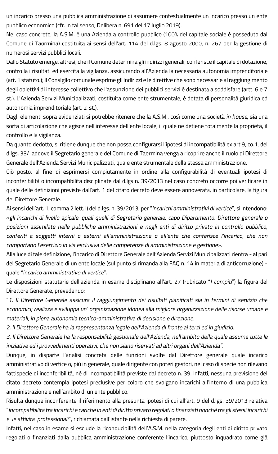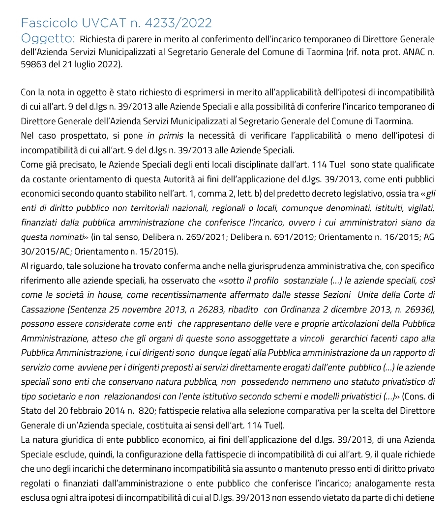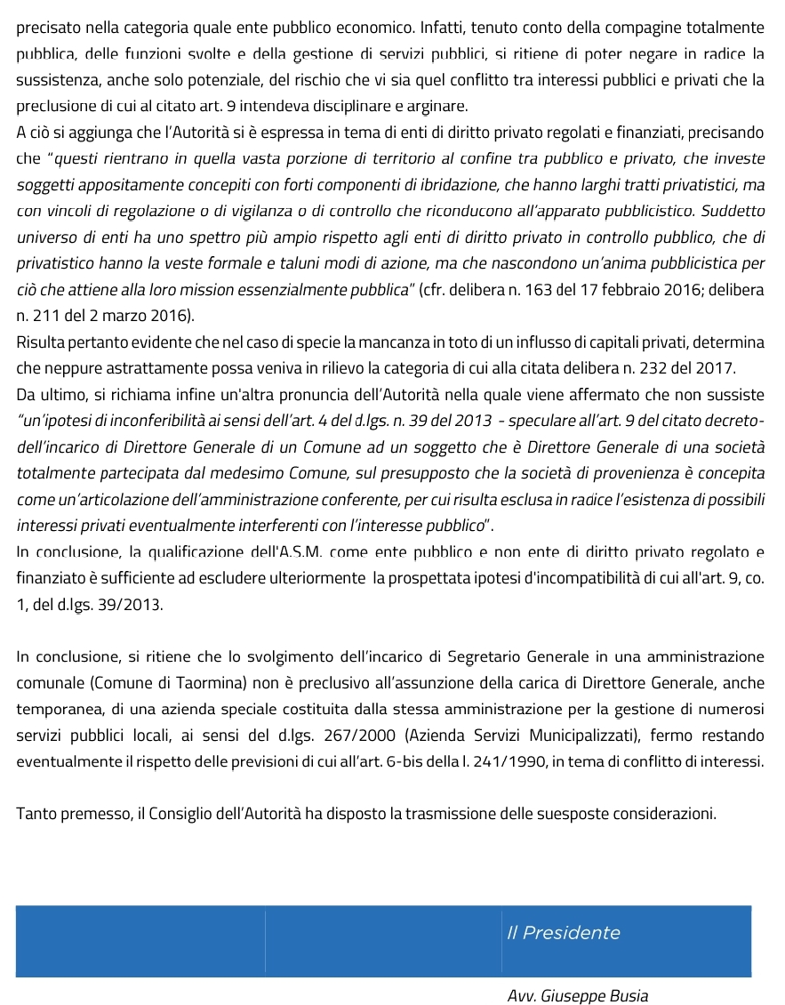 Taormina. Anac: “L’incarico di segretario del Comune non è preclusivo all’assunzione della carica di dg di Asm”