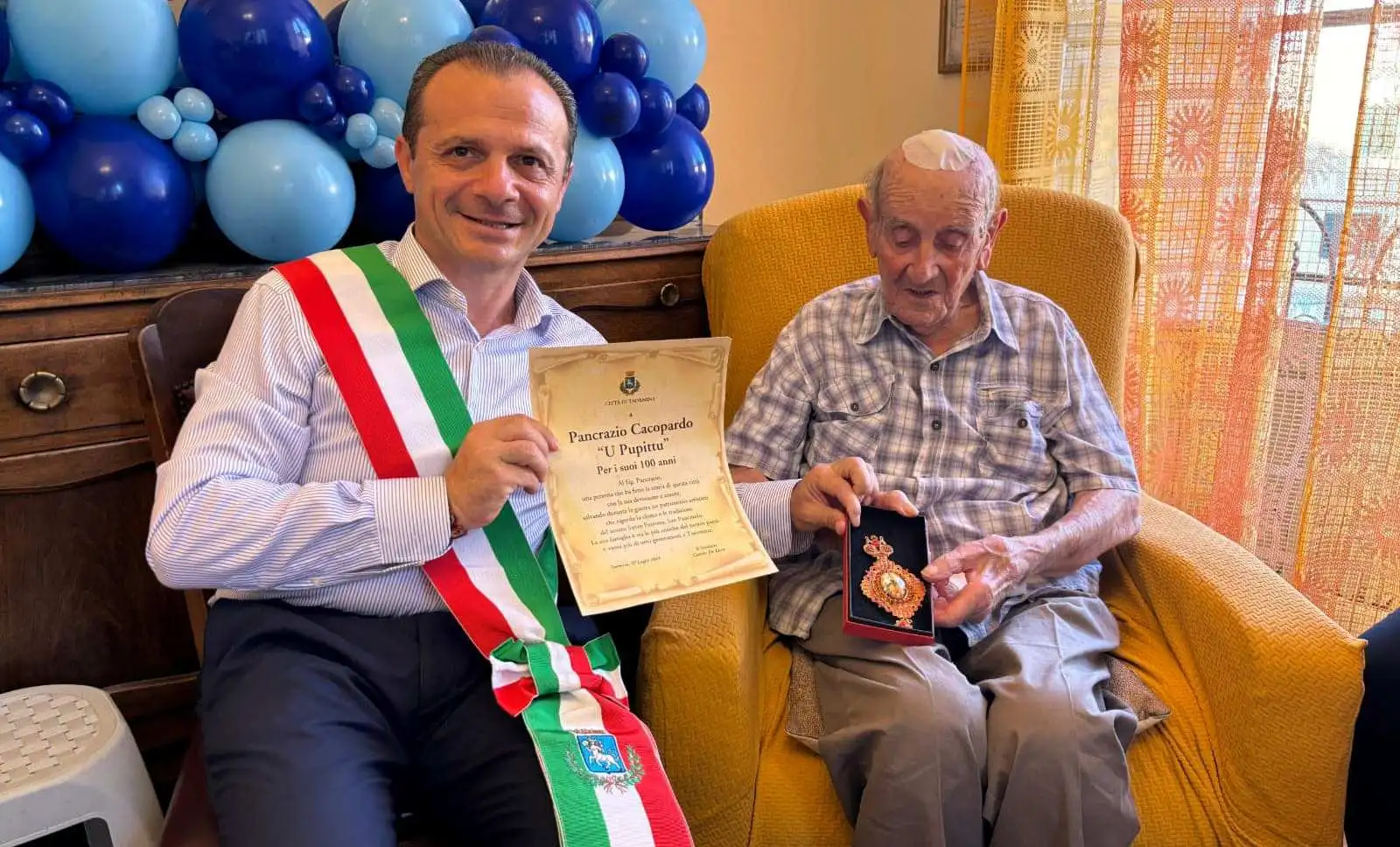 Taormina. L’Amministrazione comunale di Taormina con in testa il sindaco Cateno De Luca hanno festeggiato Pancrazio Cacopardo, affettuosamente conosciuto come “U Pupittu”, in occasione del suo centesimo compleanno. Il sindaco, insieme all’assessore Mario Quattrocchi, al presidente del Consiglio Giuseppe Composto e al consigliere comunale Antonio Gullotta, ha fatto visita a nonno Pancrazio. Durante la visita, gli amministratori hanno omaggiato il sig. Pancrazio di una pergamena con la seguente dedica: