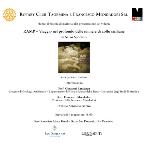 Taormina. Verrà presentato il 4 giugno alle ore 18 presso il San Domenico di Taormina, il volume fotografico “Ramp”, un viaggio nel profondo delle miniere di zolfo siciliane, realizzato dal fotografo Salvo Sportato, con un commento di Andrea Camilleri e pubblicato dall’editore Francesco Mondadori, giovane erede di Arnoldo Mondadori, fondatore della storica casa editrice. L’evento è organizzato dal Rotary Club Taormina in collaborazione con Libreventi e Libreria Mondadori Taormina. “Il mio obiettivo è quello di portare il libro a competere con l’oggettistica presente in ogni casa e non ho mai condiviso la tendenza, da parte della maggioranza degli editori, a considerare un libro stampato un progetto finito”. Questi concetti sono i principi alla base della visione di Francesco Mondadori, 25 anni, figlio di Leonardo Mondadori, che, dopo aver studiato all’estero, ha deciso di tornare in Italia per dare vita ad un grande progetto editoriale: il marchio More Mondadori. Dopo l’introduzione di Antonella Ferrara, e i saluti del Presidente del Rotary Taormina, Salvatore Coppolino e dell’Assistente del Governatore del Distretto, Arcangelo Cordopatri, Giovanni Randazzo, docente di Geologia Ambientale presso l’Università di Messina, ci guiderà in un viaggio emozionante alla scoperta delle miniere di zolfo siciliane. Il libro fotografico realizzato dal fotografo siciliano Salvo Sportato, ritrae in modo preciso, lo stato attuale delle zolfatare sicule. Le foto mostrano la curiosa combinazione tra l’urgenza legata alla possibile perdita delle testimonianze dell’esistenza stessa delle miniere e la totale ed assoluta inerzia dei luoghi e delle atmosfere, quasi che entrandovi ed osservando quanto vi rimane, si accedesse ad un non-luogo sospeso nel tempo e nello spazio. Un luogo per privilegiati che si vuole testimoniare. Andrea Camilleri commenta con l’autore la realtà di tale fenomeno che ha caratterizzato quasi due secoli di storia economico/sociale siciliana. In conclusione, Francesco Mondadori presenterà la mostra fotografica allestita presso il San Domenico per l’occasione.