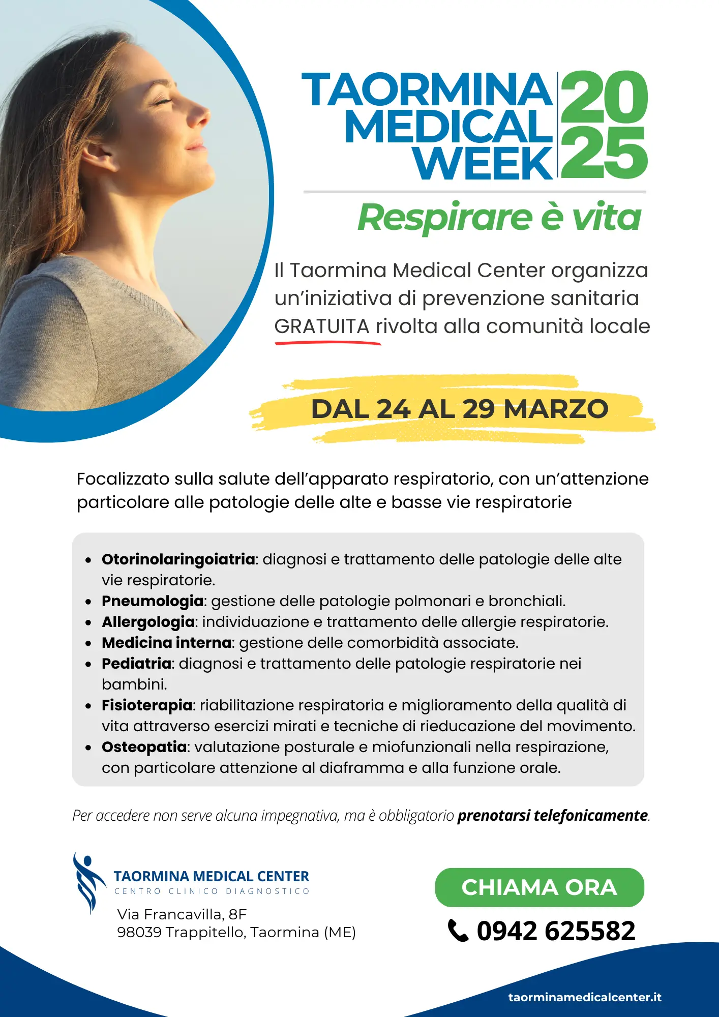 Il Taormina Medical Center (TMC), centro clinico diagnostico d’eccellenza a Taormina, annuncia l’evento “Respirare è vita”, un’iniziativa di prevenzione sanitaria gratuita dedicata alla salute dell’apparato respiratorio. L’evento si svolgerà dal 24 al 29 marzo 2025 nell’ambito del programma Taormina Medical Week 2025, una serie di appuntamenti mensili volti a promuovere la prevenzione e la salute pubblica.