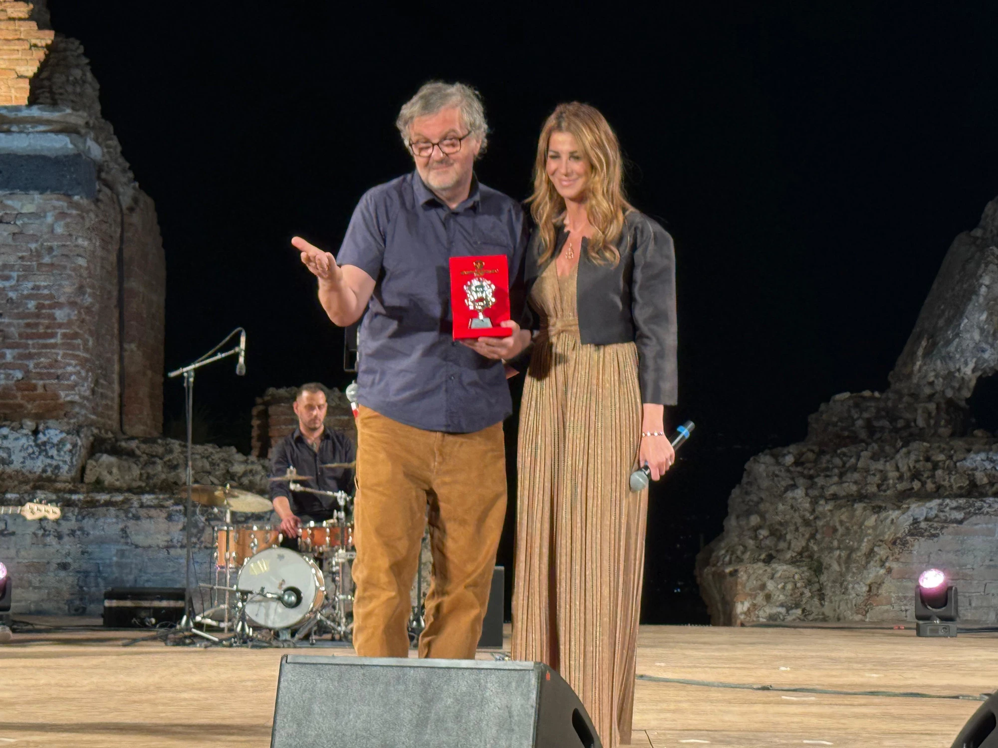 Taormina. Standing ovation per il grande comico pugliese Uccio De Santis, che sabato 28 giugno, sul palco del Teatro Antico di Taormina, ha ricevuto, con pieno merito, il Nations Award. L’artista barese era già stato sul palcoscenico millenario di Taormina il 13 agosto 2018, quando fu il protagonista assoluto dello spettacolo “Vi racconto il mio Mudù”. Lo show, organizzato dal giornalista taorminese Saro Laganà, registrò un entusiasmante sold out. Un fiume di risate, applausi e ricordi che ancora oggi riecheggiano tra le pietre antiche del teatro, testimoniando l’amore viscerale del pubblico nei confronti di un grande artista seguito sui social da milioni e milioni di follower.