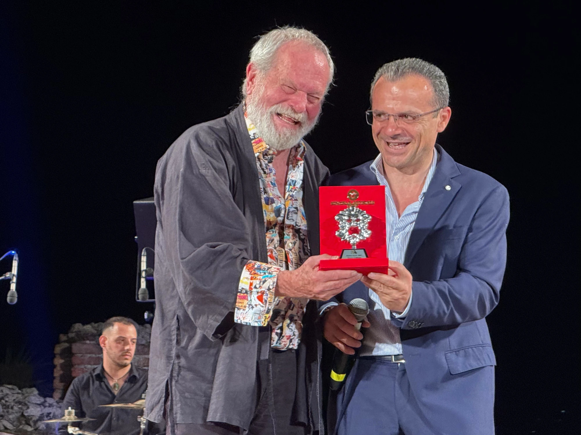 Gilliam, premiato dal sindaco taorminese Cateno De Luca, ha ricordato di essere stato qui circa mezzo secolo fa per il suo primo film: “Sono diventati tutti più vecchi, io in particolare – ironizza – non vedo troppo cambiamento. È sempre bellissimo, i premi in realtà non mi interessano molto, ma mi danno accesso a posti belli come questo”. E sui prossimi progetti anticipa: “Voglio fare un film apocalittico, però sono sono tutti molto indaffarati in Israele, in Iran… questo è il problema”. Promuove le piattaforme per il cinema, ma “l’esperienza dentro le sale, con molte persone, è un’altra cosa, ti senti piccolo rispetto al grande schermo; ricordo persone nella metro a Londra che guardavano Star Wars sull’iPhone. I film sono specchio della società ma molte volte i film imitano la società; al momento non sto vedendo troppi film interessanti, vorrei essere maggiormente sorpreso”.