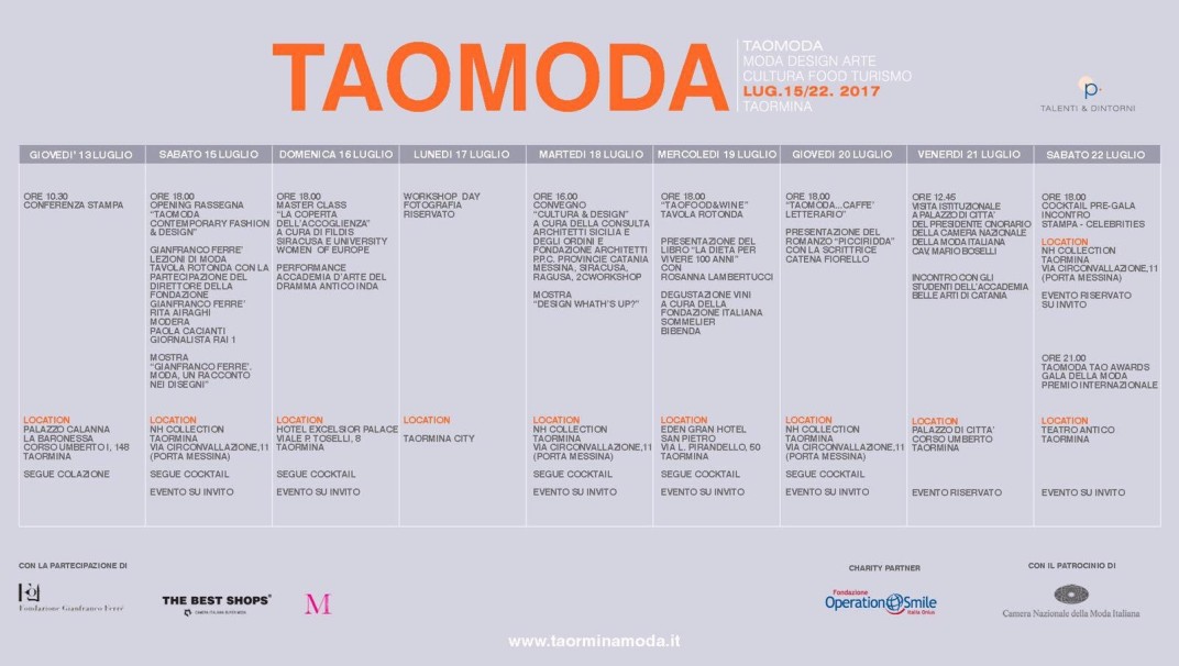 L’opening sarà dedicato il pomeriggio di sabato 15 luglio a Gianfranco Ferré, nel decimo anno della scomparsa dell’architetto della moda, con una mostra allestita nel fashion hub dell’NH Collection di Taormina, eccezionale esclusiva, che sarà possibile ammirare fino a domenica 23 luglio con alcuni degli abiti e dei disegni dello stilista che ha fatto la storia del made in Italy. Parteciperà Rita Airaghi, direttore della Fondazione. Altri appuntamenti da segnalare: domenica 16 luglio la masterclass con la stilista Filly Biz organizzata in collaborazione con la Fildis Siracusa e University Women of Europe dedicata alla cultura dell’integrazione; mercoledì 19 luglio Tao Food&Wine (in sinergia con la Fondazione Italiana Sommelier e BIBENDA) all’Eden Grand Hotel San Pietro, ospite Rosanna Lambertucci che racconterà i segreti della “dieta per vivere cento anni”; giovedì 20 luglio Caffè Moak firma Taomoda Caffè Letterario, realizzato con il supporto dell’Associazione Arte&Cultura a Taormina, ospite nella terrazza dell’NH Collection la scrittrice Catena Fiorello che presenterà il romanzo “Picciridda” edito da Giunti; “Design What’s up” e il convegno degli architetti che decreteranno il vincitore del Tao Award Talent Design, in programma sempre nell’hub dell’NH Collection.