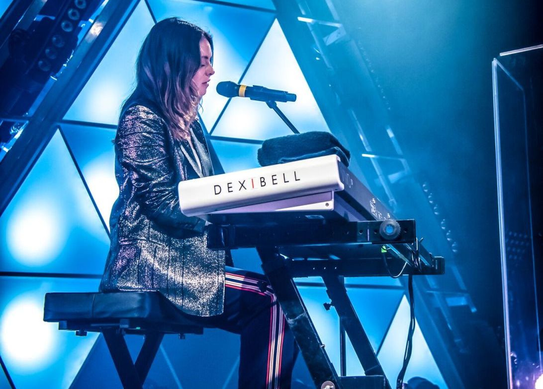 Δ∇Δ si trasforma così in un’installazione iconica che sprigiona luminosità e che caratterizza la scena con giochi di luce, anche laser, e cromie. Ogni triangolo al suo interno contiene tanti triangoli, in una struttura che richiama il tangram, gioco semplice ma raffinato, e che diventa anche interattiva: la loro illuminazione in alcuni momenti del live è comandata direttamente da Francesca attraverso la tastiera che sta suonando.